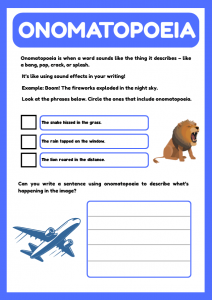 Engaging onomatopoeia worksheet for kids aged 7–10! Perfect for teaching sound words in a fun, creative way. Great for ESL learners and primary classrooms.