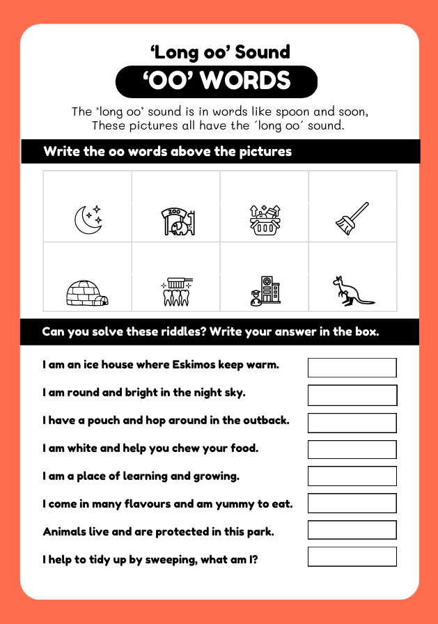 Long and Short “oo” Sound Worksheets for Kids (Ages 5–8) – Write Words, Match Pictures & Solve Riddles