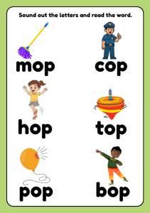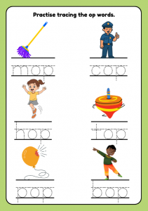 This engaging printable worksheet pack helps pupils practise blending, reading, tracing, and writing CVC words such as mop, cop, hop, top, pop, and bop.