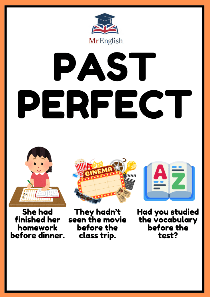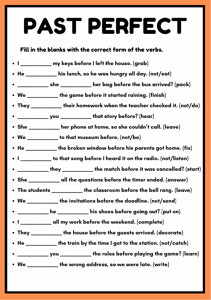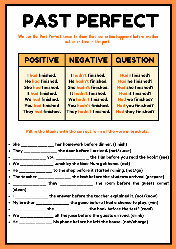 Download this fun and clear Past Perfect worksheet for learners aged 10–12. Includes examples and fill-in-the-blank exercises. Great for ESL, EFL, and classroom grammar lessons!