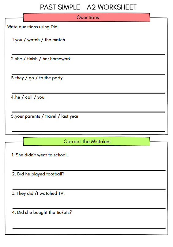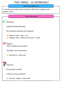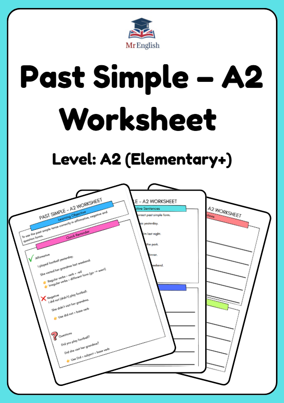 A structured A2 Past Simple worksheet for Ages 10–14 (Elementary+) covering affirmative, negative and question forms. Includes regular and irregular verbs, sentence transformation tasks and common mistake correction — ideal for ESL learners, classroom practice and homework revision.