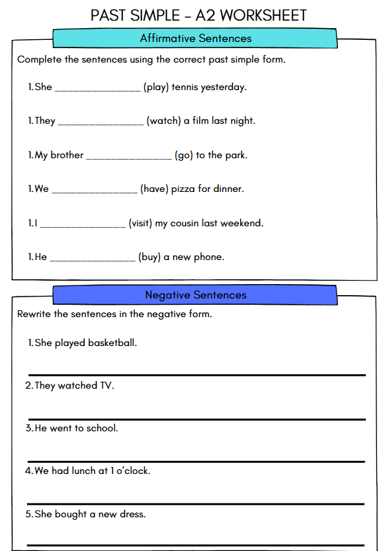Past Simple Worksheet – A2 (Ages 10–14) | Affirmative, Negative & Questions