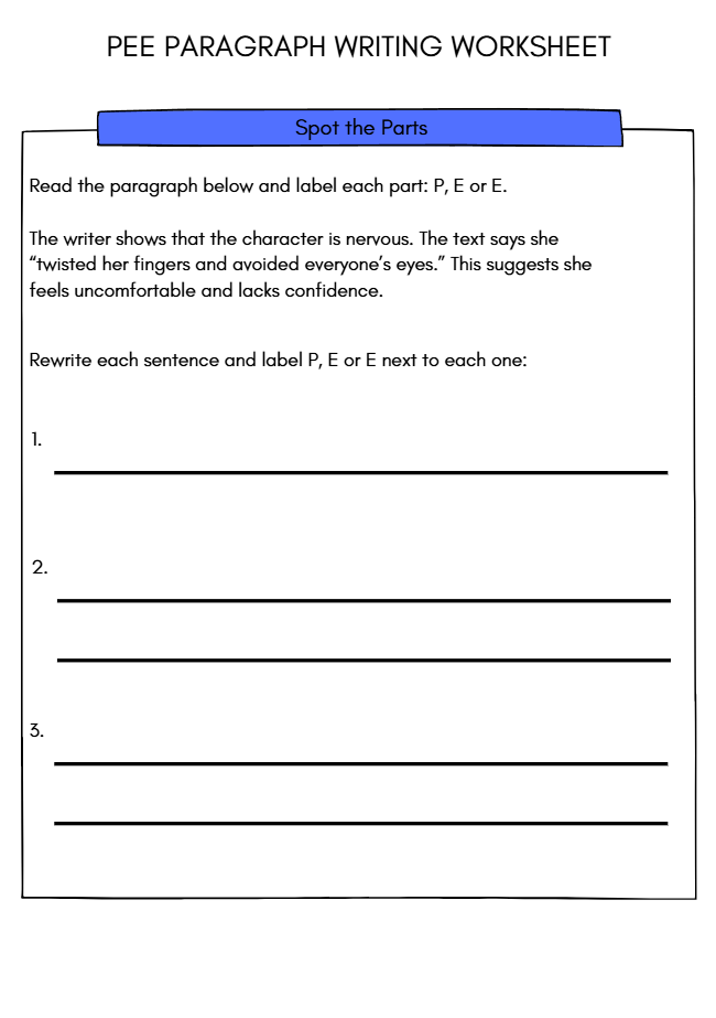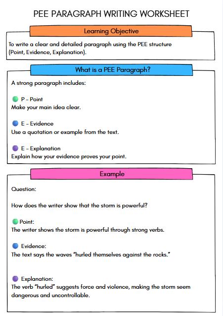 The PEE Paragraph Writing Worksheet for ages 9–11 is designed to make writing engaging and fun for upper KS2 students. With interactive elements and clear guidance, children will enjoy expressing their thoughts in a structured way. This resource encourages creativity and helps develop essential reading and writing skills, making it an enjoyable tool for young learners as they explore their ideas.