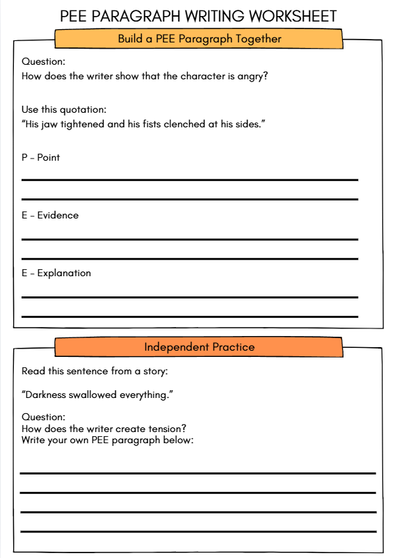 A structured Upper KS2 PEE paragraph worksheet for Ages 9–11 (Year 5 & 6) designed to help pupils write clear explanations using Point, Evidence and Explanation. Includes model examples, guided practice, independent analysis and a challenging tension paragraph task — ideal for SATs preparation and reading comprehension skills.