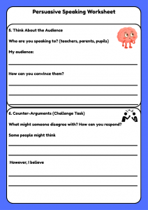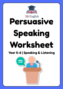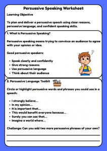A persuasive speaking worksheet for Year 5–6 pupils. Includes planning tasks, persuasive language, a model speech, writing task, and speaking practice—ideal for primary teachers, tutors, and online lessons.