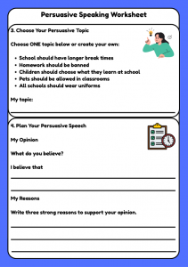 Discover the exciting world of Persuasive Speaking Worksheet designed for Year 5–6 students! This engaging resource allows kids aged 9–11 to unleash their creativity and enhance their communication skills. They'll love sharing their opinions and learning how to convince others in a fun and interactive way. By practicing persuasive speaking, children gain confidence and find their voice, making this a delightful addition to their primary English experience!
