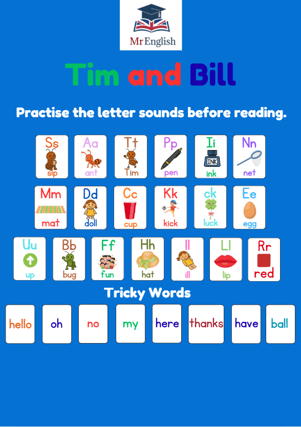 Tim and Bill is a sweet and simple Phase 2 phonics storybook for ages 4–6, designed to help young readers build confidence with CVC words and early tricky words.