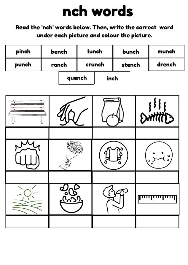Phase 4 phonics worksheet for ages 5–7. Children colour pictures, write the “nch” word under each image, and practise writing sentences on the next page. Great for early readers learning Phase 4 blends at home or in the classroom.