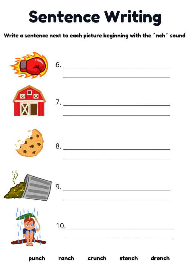 Phase 4 "NCH" Phonics Worksheets for kids aged 5–7 provide an engaging way to enhance literacy skills through colorful activities. Kids will enjoy the vibrant designs that make learning fun and interactive. The combination of writing and sentence formation helps to develop their creativity and confidence in language, turning what could be a mundane task into an exciting adventure. These worksheets offer a playful approach to phonics, ensuring children are eager to participate and learn.