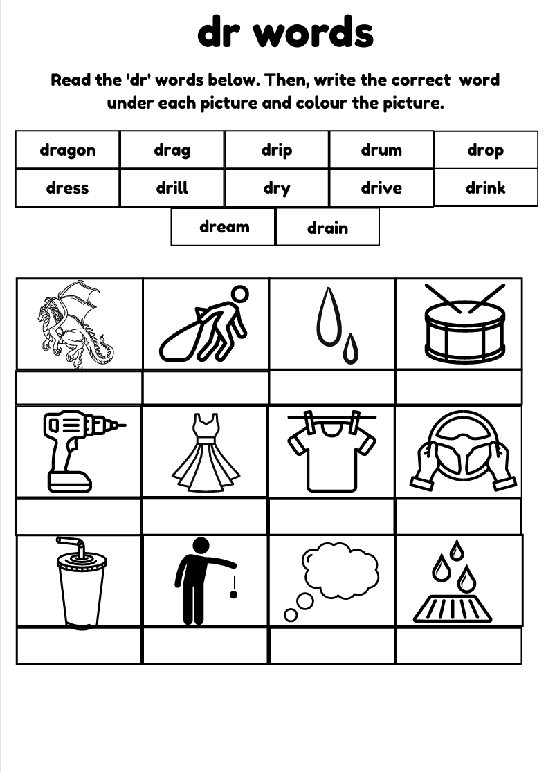 Phase 4 phonics worksheet to practise DR words for children ages 5–7. Engaging activity with blends like drum, drip, drop, and dragon. Ideal for early readers and ESL learners.