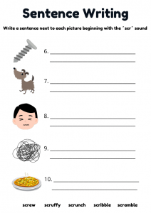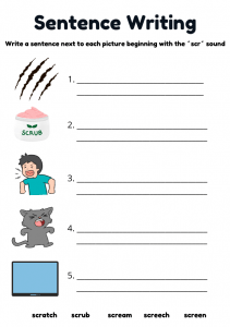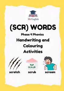 Phase 4 phonics worksheet for ages 5–7. Children colour pictures, write the “scr” word under each image, and practise writing sentences on the next page. Perfect for early readers learning Phase 4 blends at home or in school.