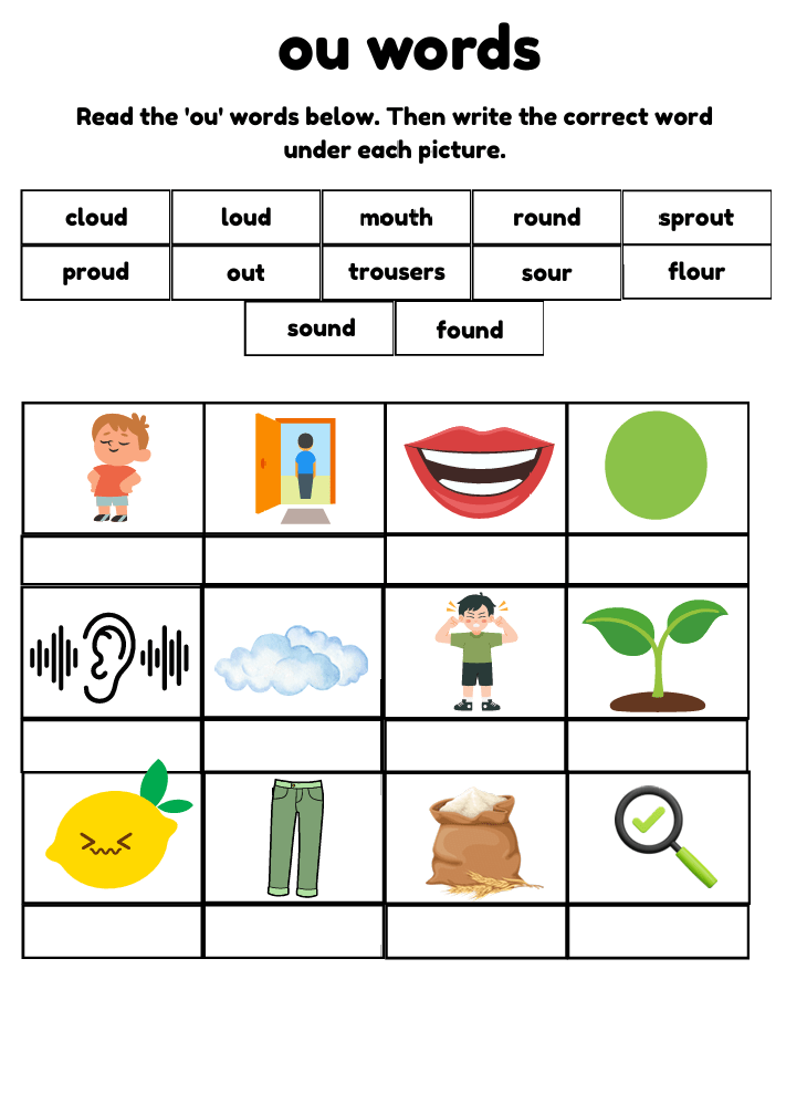 Phase 5 Phonics OU Words Activities for Kids (Ages 6–7) are designed to make learning exciting and enjoyable. Kids at this age thrive on engaging and interactive experiences, and these activities provide just that. With fun games and engaging challenges, children can explore new sounds and words in a playful environment, fostering their love for reading. The colorful visuals and hands-on activities keep their attention and inspire a sense of achievement, motivating them to learn and play simultaneously.
