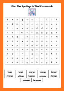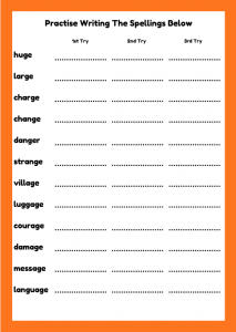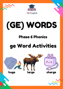 Fun Phase 6 phonics worksheets focusing on GE words (huge, large, change, danger). Includes spelling practice, sentence writing, missing words and a word search. Ideal for children aged 6–8, Year 2 and early Year 3 learners.