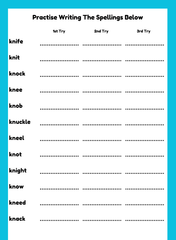 Help children master Phase 6 phonics with these engaging KN words worksheets, focusing on the silent K spelling pattern (knife, knock, knee, knight, knack and more).
