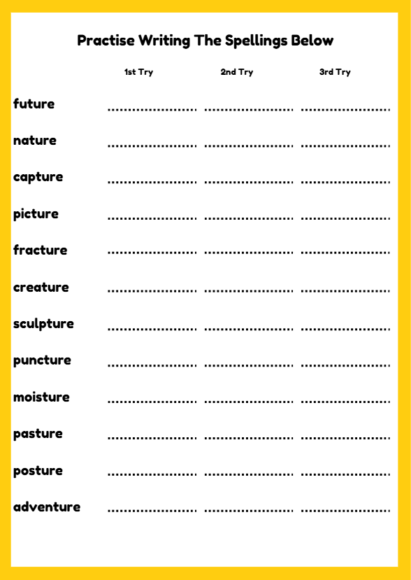 Phase 6 Phonics (-ture) words worksheets are a fantastic way for kids aged 7 to 9 to enhance their spelling skills in an engaging manner. These activities introduce a fun and interactive approach to learning, making it enjoyable for children as they explore new words. The challenge of spelling, combined with creative exercises, keeps kids motivated and eager to improve their reading and writing abilities. With a variety of activities to choose from, students can have fun while mastering essential phonics concepts!