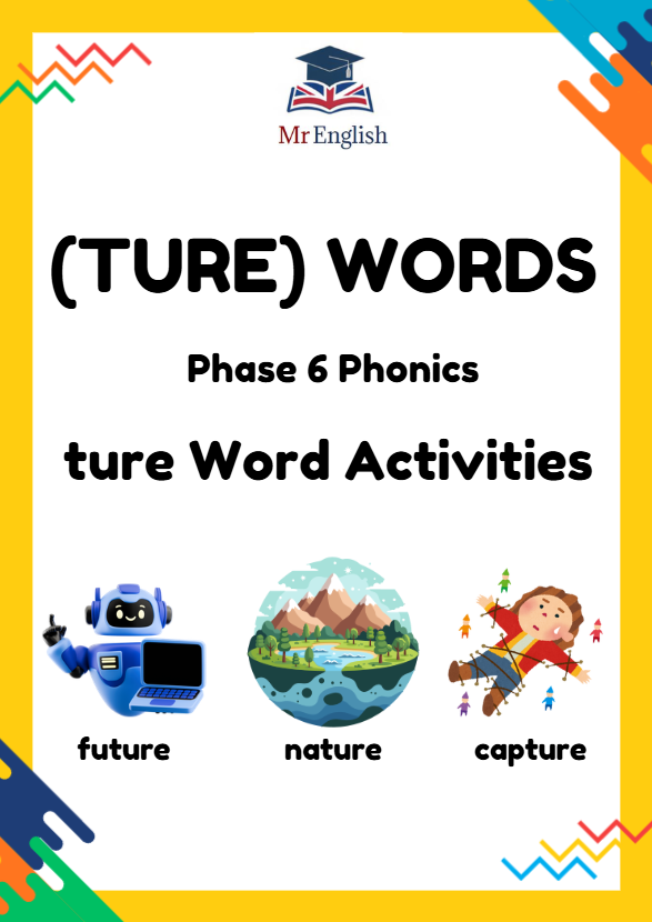 Printable Phase 6 phonics worksheets focusing on (-ture) word endings. Includes spelling practice, picture matching, sentence writing and word searches. Perfect for children aged 7–9, Year 2–Year 4, home learning and classrooms.