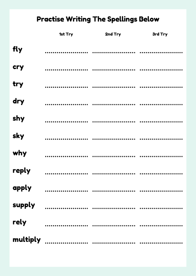 Fun and engaging Phase 6 phonics Y words worksheets for ages 6–7. Children practise spelling words like fly, cry, try, apply, and multiply using writing tasks, sentence activities, and a wordsearch. Ideal for Year 2, KS1, and home learning.