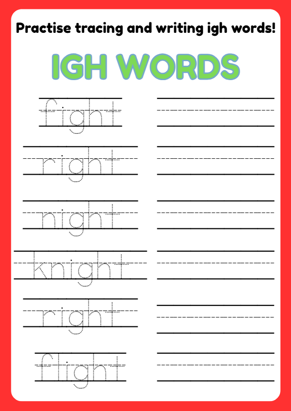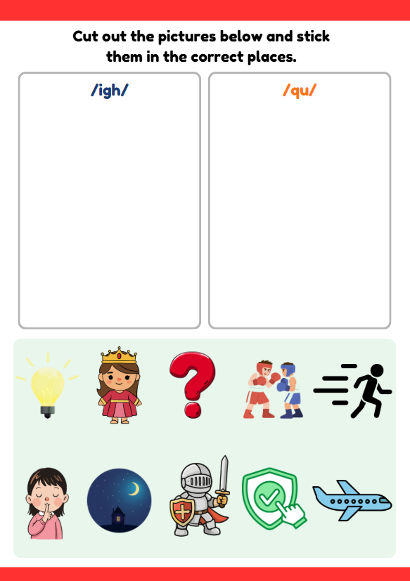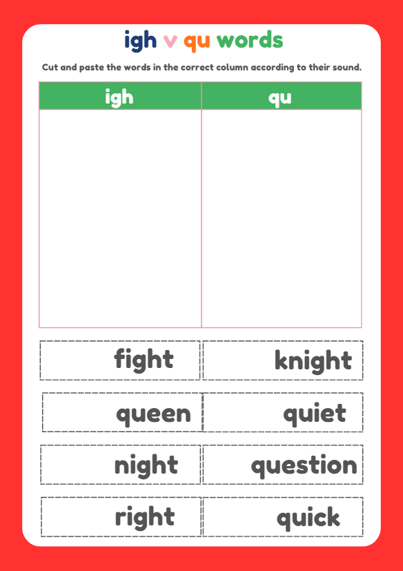 Help children practise phonics with this fun IGH vs QU words worksheet for ages 5–7. Includes cut-and-paste sorting, word recognition, and tracing activities to build early reading and spelling skills. Perfect for ESL learners, phonics lessons, and early years classrooms.