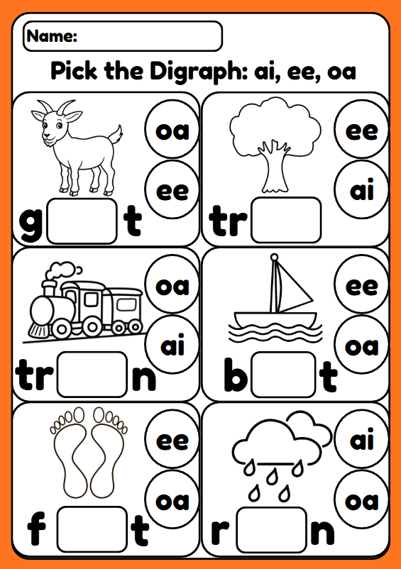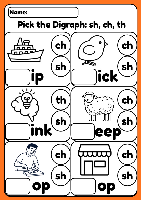 Children simply look at the picture, say the word aloud, and pick the correct digraph, reinforcing sound recognition and blending skills in a fun, accessible way.