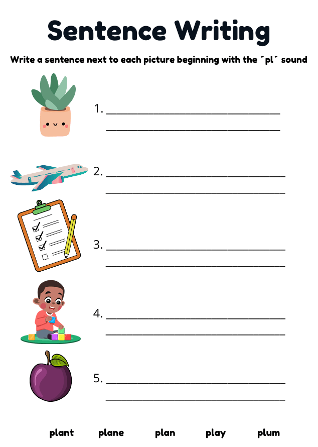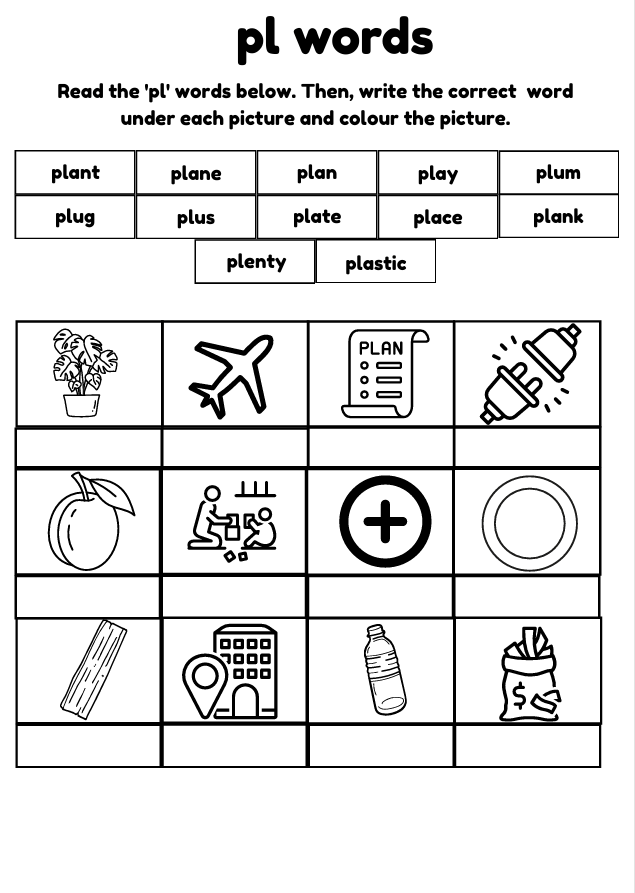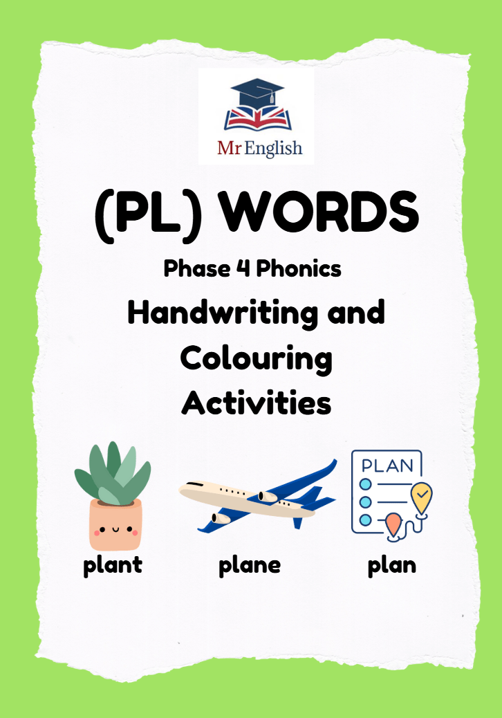 Engaging PL words worksheets for children ages 4–7 learning Phase 4 phonics. Includes handwriting, colouring, and sentence writing activities with words like plane, plant, play, plug, plate, and more.