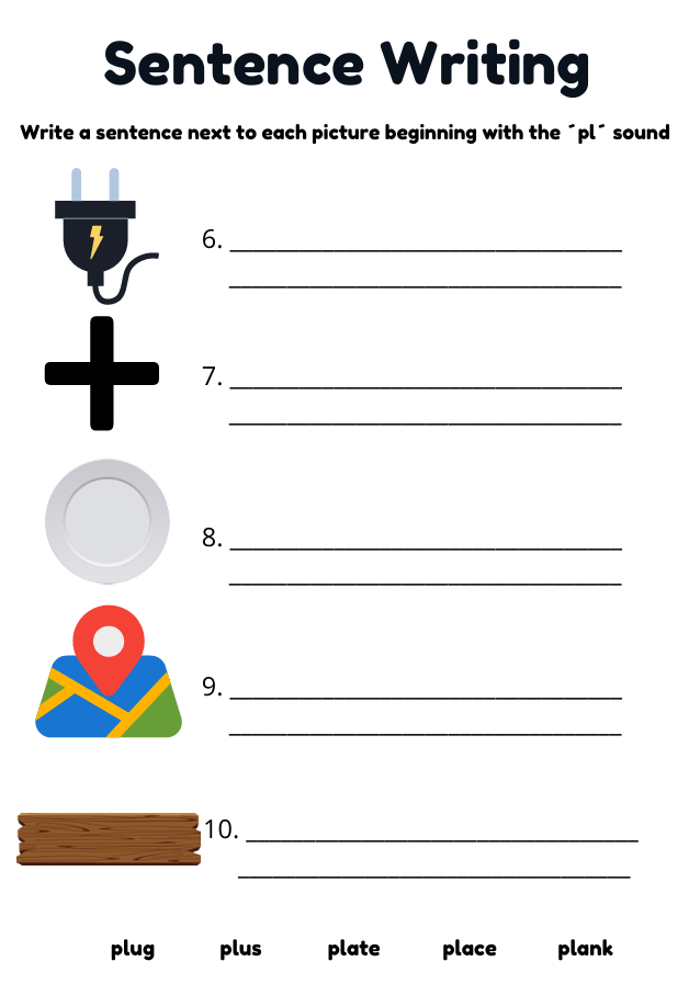 Engaging PL words worksheets for children ages 4–7 learning Phase 4 phonics. Includes handwriting, colouring, and sentence writing activities with words like plane, plant, play, plug, plate, and more.