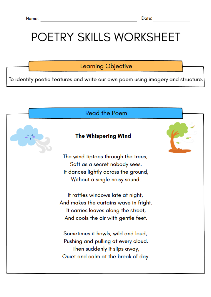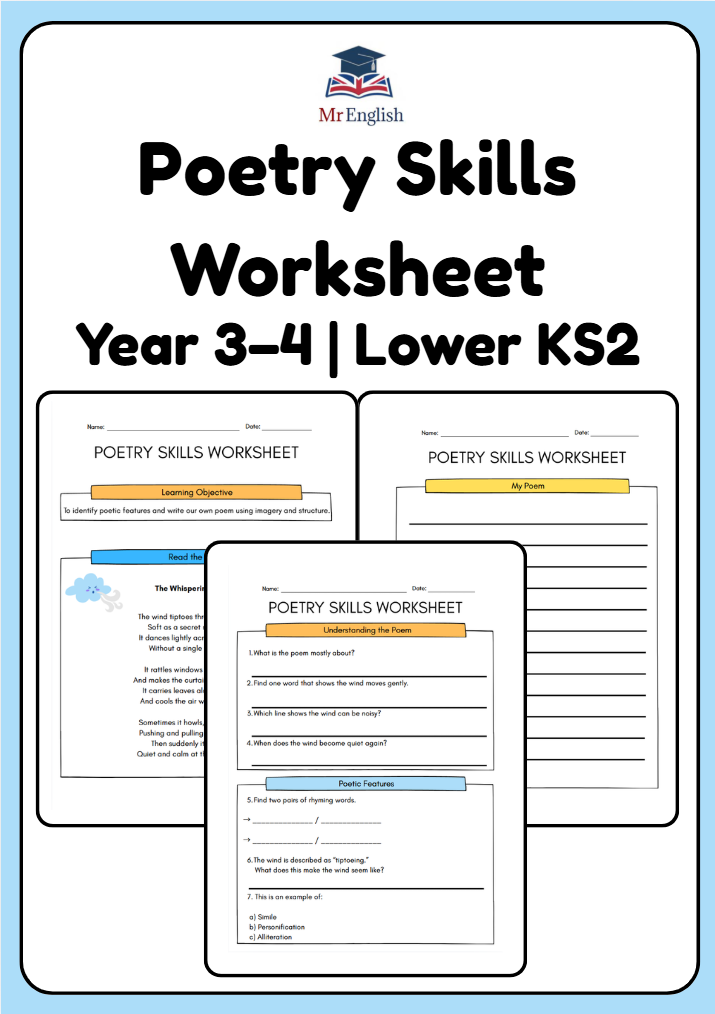 Engaging Poetry Skills Worksheet for Year 3–4 (Ages 7–9) in Lower KS2. This printable poetry comprehension and writing resource helps children identify rhyming words, personification, imagery, similes, and key poetic features. Includes a poem analysis section, vocabulary questions, and a structured creative writing task where pupils write their own poem with rhyme and personification. Perfect for classroom lessons, homework, SATs preparation, or independent literacy practice.
