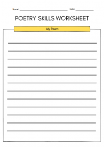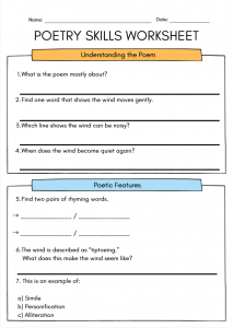 Engaging Poetry Skills Worksheet for Year 3–4 (Ages 7–9) in Lower KS2. This printable poetry comprehension and writing resource helps children identify rhyming words, personification, imagery, similes, and key poetic features. Includes a poem analysis section, vocabulary questions, and a structured creative writing task where pupils write their own poem with rhyme and personification. Perfect for classroom lessons, homework, SATs preparation, or independent literacy practice.