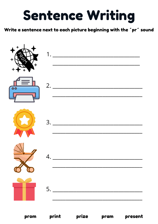 Engaging PR words worksheets for children ages 4–7 learning Phase 4 phonics. Includes handwriting, colouring, and sentence writing activities with words like proud, prize, print, princess, problem, promise, and more.
