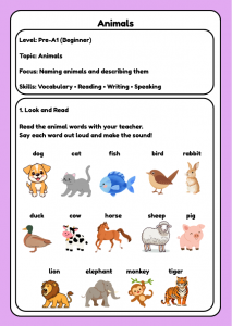 Help children aged 4–7 learn English animal names with this exciting Mr English Pre-A1 Animals worksheet.