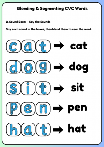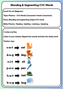 Fun Pre-A1 phonics worksheet for ages 4–7 to practise blending and segmenting CVC words like cat, dog, sun, and hat. Builds reading and spelling confidence.