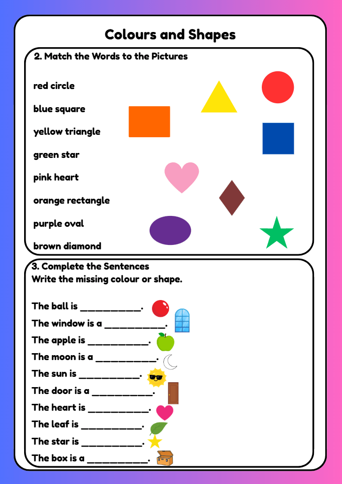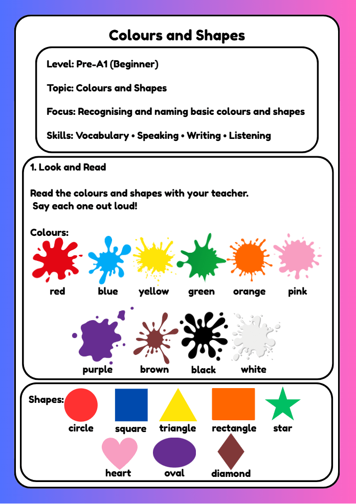 Help children aged 4–7 learn colours and shapes with this bright and engaging Mr English Pre-A1 worksheet.
