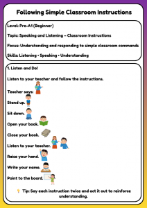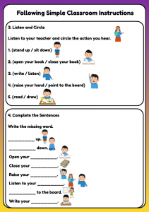 Kids aged 4–7 thrive in interactive learning environments, and the Pre-A1 Following Simple Classroom Instructions Worksheet offers just that! Engaging worksheets encourage young learners to actively participate, making learning fun and enjoyable. Through playful activities, children are excited to follow instructions, fostering a sense of accomplishment and boosting their confidence. This sparks their curiosity and keeps them motivated, transforming the classroom experience into an adventure!