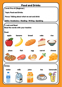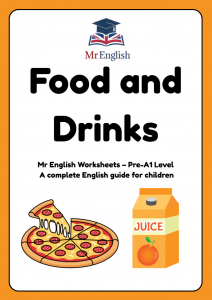 Help children aged 4–7 learn English food and drink vocabulary with this colourful Mr English Pre-A1 worksheet.