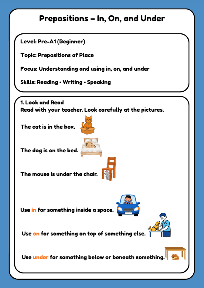 Pre-A1 In, On, and Under Worksheet for Kids (Ages 4–7)