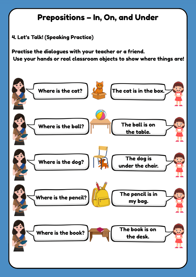 Students learn how to use in, on, and under through pictures, fill-in-the-blank sentences, and fun classroom dialogues.