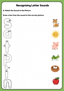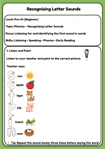 Fun Pre-A1 phonics worksheet for ages 4–7 to recognise letter sounds like s, a, t, p, i, and n. Builds listening, speaking, and early reading skills.