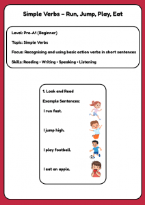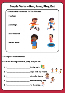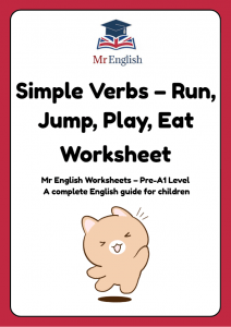 This Pre-A1 Mr English worksheet helps children aged 4–7 learn and practise simple action verbs: run, jump, play, and eat.