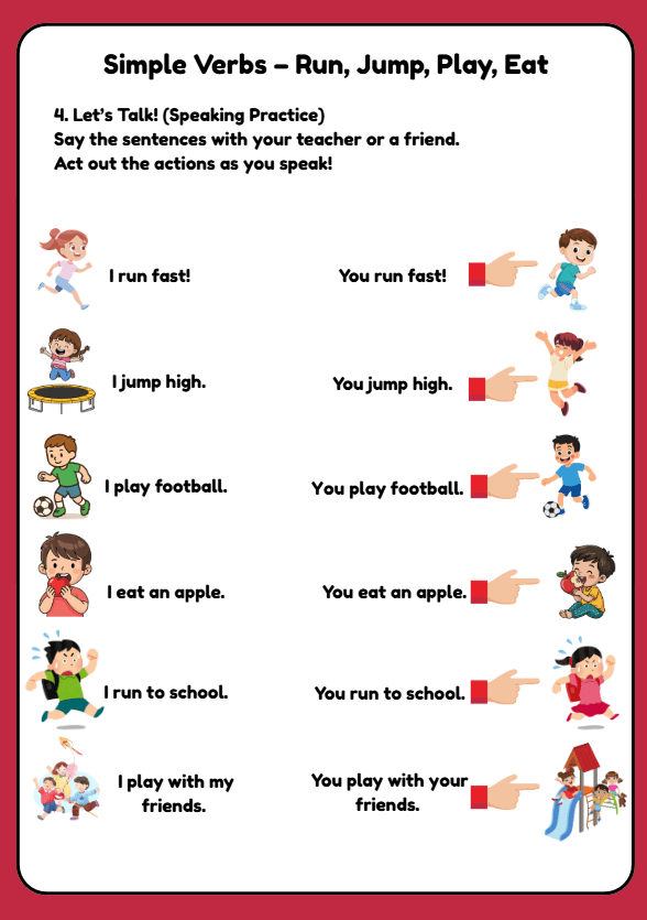 Through matching, writing, and speaking activities, students build confidence using verbs in short sentences like I run fast or I eat pizza.