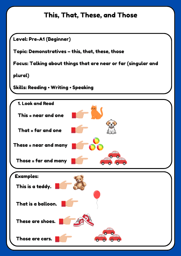 Kids aged 4 to 7 will enjoy the Pre-A1 This, That, These, and Those Worksheet because it makes learning fun and interactive. The colorful designs and engaging activities capture their attention, making it easier for them to grasp basic concepts. Worksheets like these encourage hands-on participation, allowing children to learn at their own pace while fostering a sense of accomplishment.