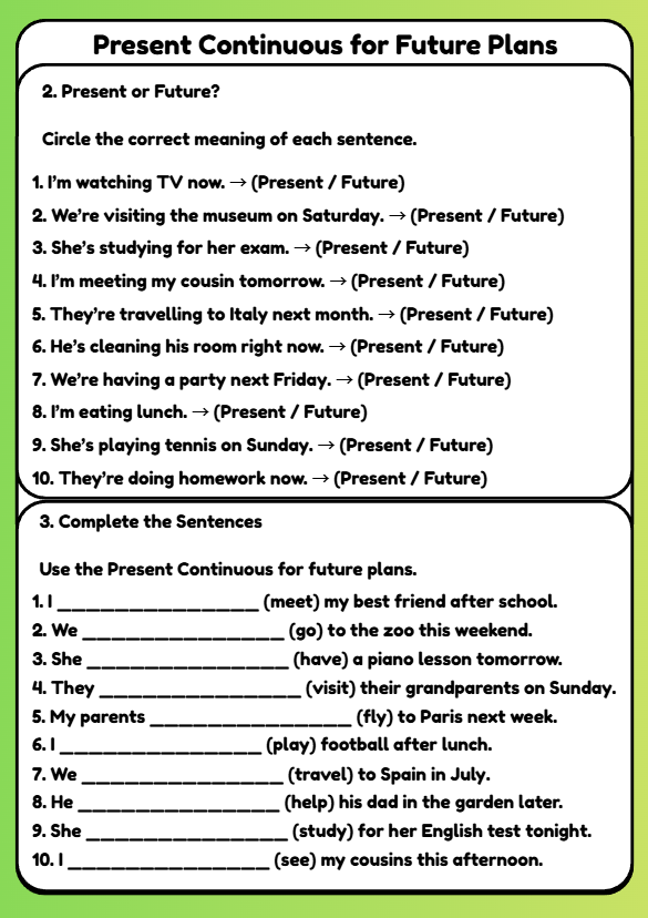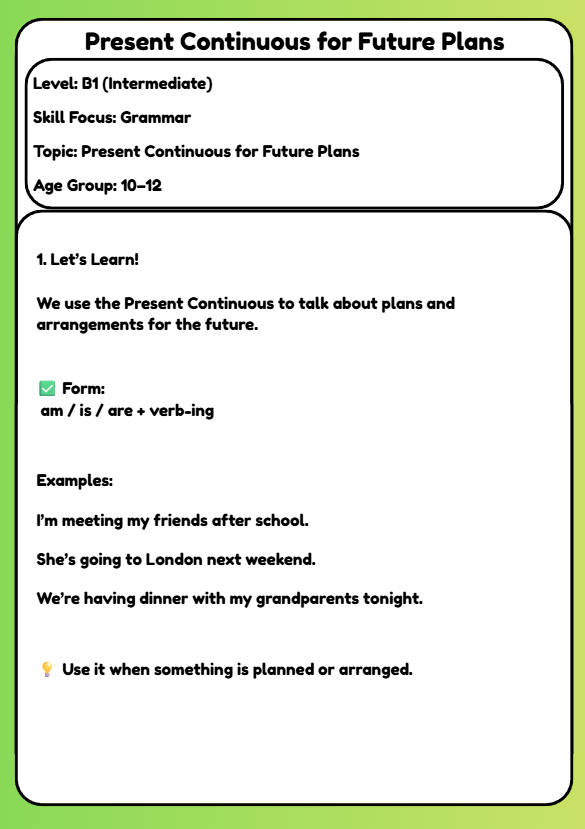 Learn how to use the Present Continuous to talk about future plans! This fun B1 English grammar worksheet helps learners aged 10–12 practise am/is/are + verb-ing through examples, dialogues, and writing tasks — perfect for Cambridge B1 and ESL students.