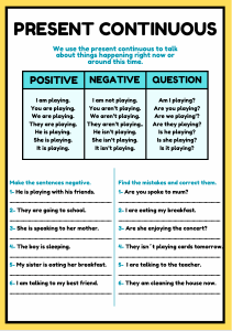 Download this printable Present Continuous worksheet for kids aged 7 to 11. Includes fun ESL grammar activities: positive, negative, and question forms, error correction, and verb gap-fills. Great for classroom or online English lessons!
