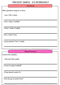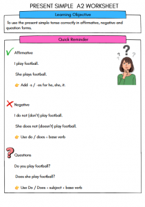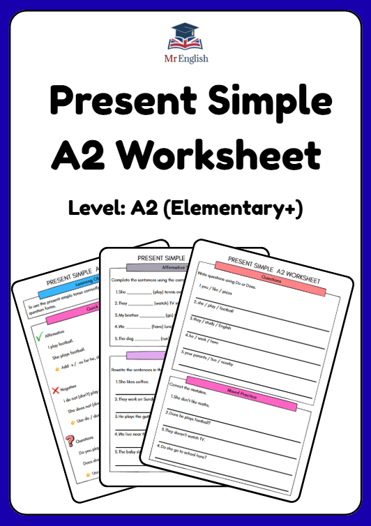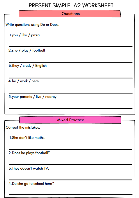 A clear and engaging Present Simple A2 worksheet for ESL learners aged 8–12. Includes affirmative sentences, negative forms, question practice with do/does, mixed error correction, and a writing challenge to help students master present simple grammar.