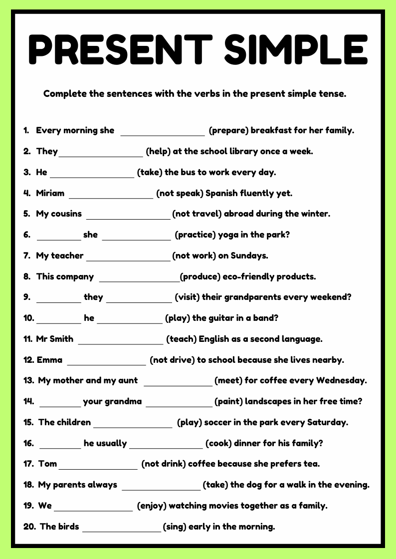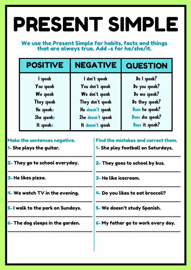 Kids aged 7 to 11 love engaging with fun and interactive activities that make learning enjoyable. A Present Simple worksheet tailored for their age group provides an opportunity for hands-on grammar practice, allowing them to explore the concept of negatives and corrections in a playful way. With visually appealing designs and examples relatable to their everyday lives, children are likely to find joy in mastering grammar through this creative resource.