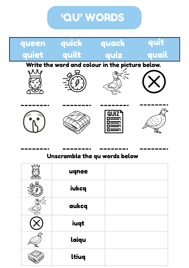 Help young learners (ages 5–7) master “qu” words with this fun and engaging printable worksheet! Includes phonics practice, handwriting, word unscramble, wordsearch, and cut-and-paste spelling activities. Perfect for early readers and ESL students