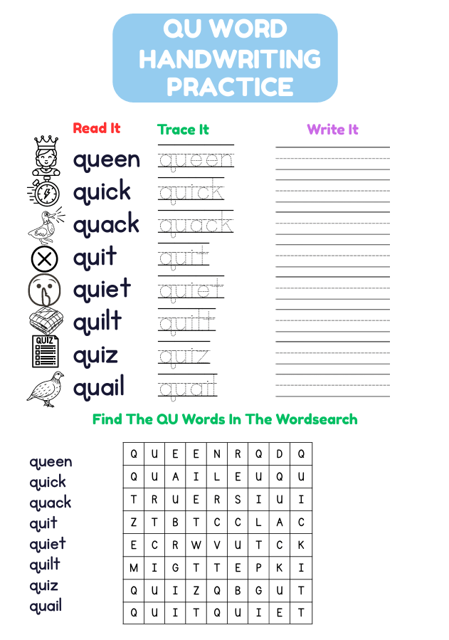 QU Words Worksheet for Kids (Ages 5–7) | Phonics, Handwriting & Wordsearch Activities