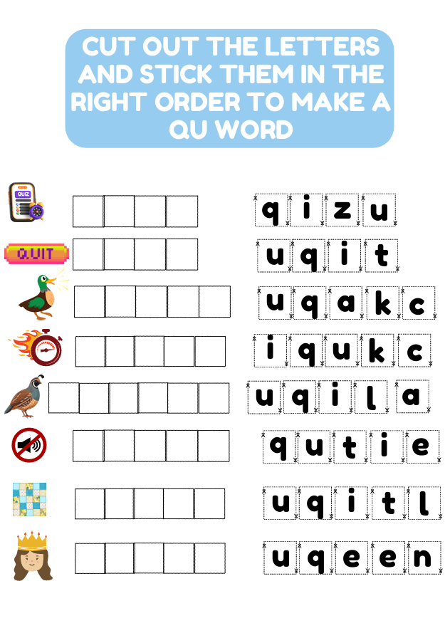 Help young learners (ages 5–7) master “qu” words with this fun and engaging printable worksheet! Includes phonics practice, handwriting, word unscramble, wordsearch, and cut-and-paste spelling activities. Perfect for early readers and ESL students