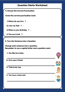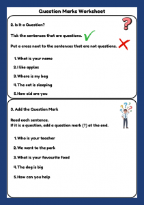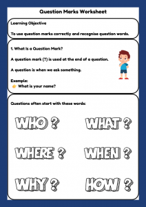 A clear and engaging Question Marks worksheet for Year 1 pupils (ages 5–6). Includes identifying questions, adding question marks, choosing correct punctuation, rewriting sentences, and writing questions using question words.