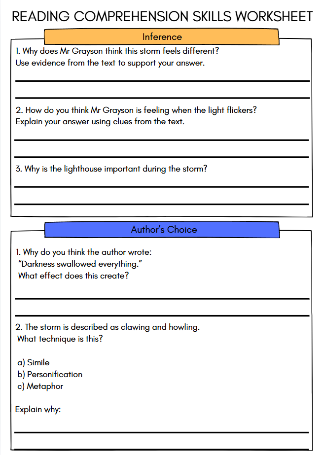 Develop key reading skills with this engaging Upper KS2 Reading Comprehension Worksheet for Ages 9–11 (Year 5 & Year 6). Based on the suspenseful fiction text The Lighthouse Keeper’s Warning, this resource helps pupils practise retrieval, vocabulary, inference and author’s choice questions in a structured format.