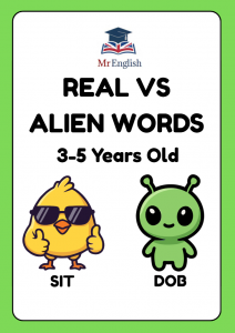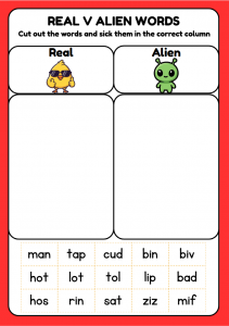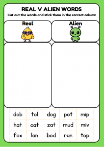 This Real vs Alien Words CVC cut-and-stick worksheet for ages 3–5 helps children practise phonics by decoding consonant-vowel-consonant words and sorting real words from silly alien words. A hands-on early reading activity that builds blending skills.