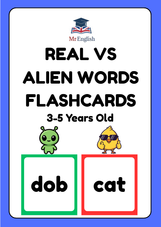 These Real vs Alien Words CVC flashcards for ages 3–5 are a hands-on phonics activity. Children cut out word cards and sort them into real and alien words to practise decoding, blending, and early reading skills.